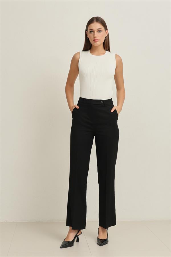Düğme detaylı tam kalıp pantolon, şıklığı ve zarafeti bir arada sunuyor. Düğme detayları pantolona şık bir vurgu yaparken, tam kalıp tasarımı modern ve zarif bir siluet oluşturuyor. Hem ofis şıklığınıza hem de gündelik kombinlerinize uyum sağlayacak bu pantolon, gardırobunuzda mutlaka bulunması gereken bir parça.