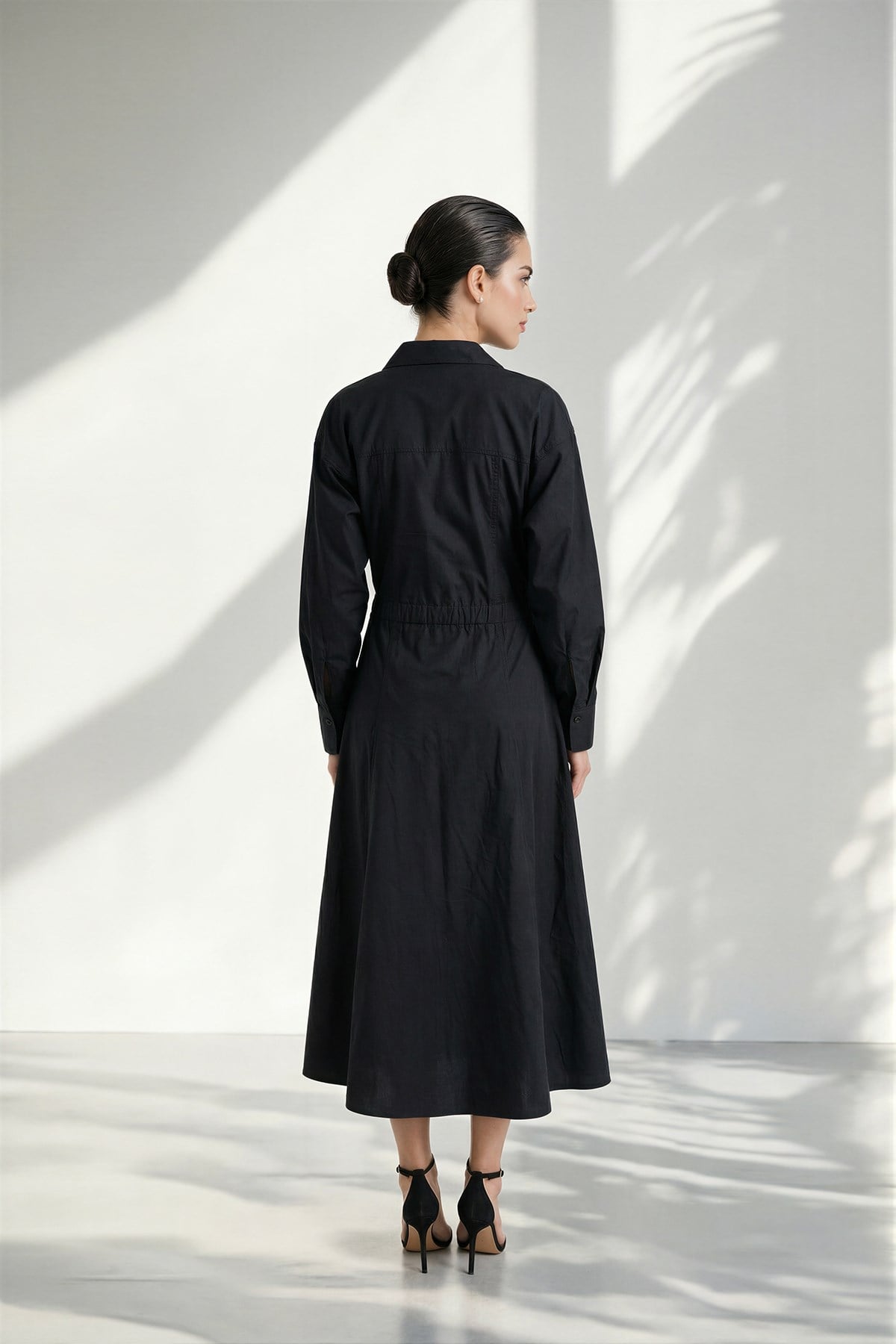 Siyah Gömlek Detaylı Uzun Kollu Belden Oturtmalı Rahat Kesim Elbise