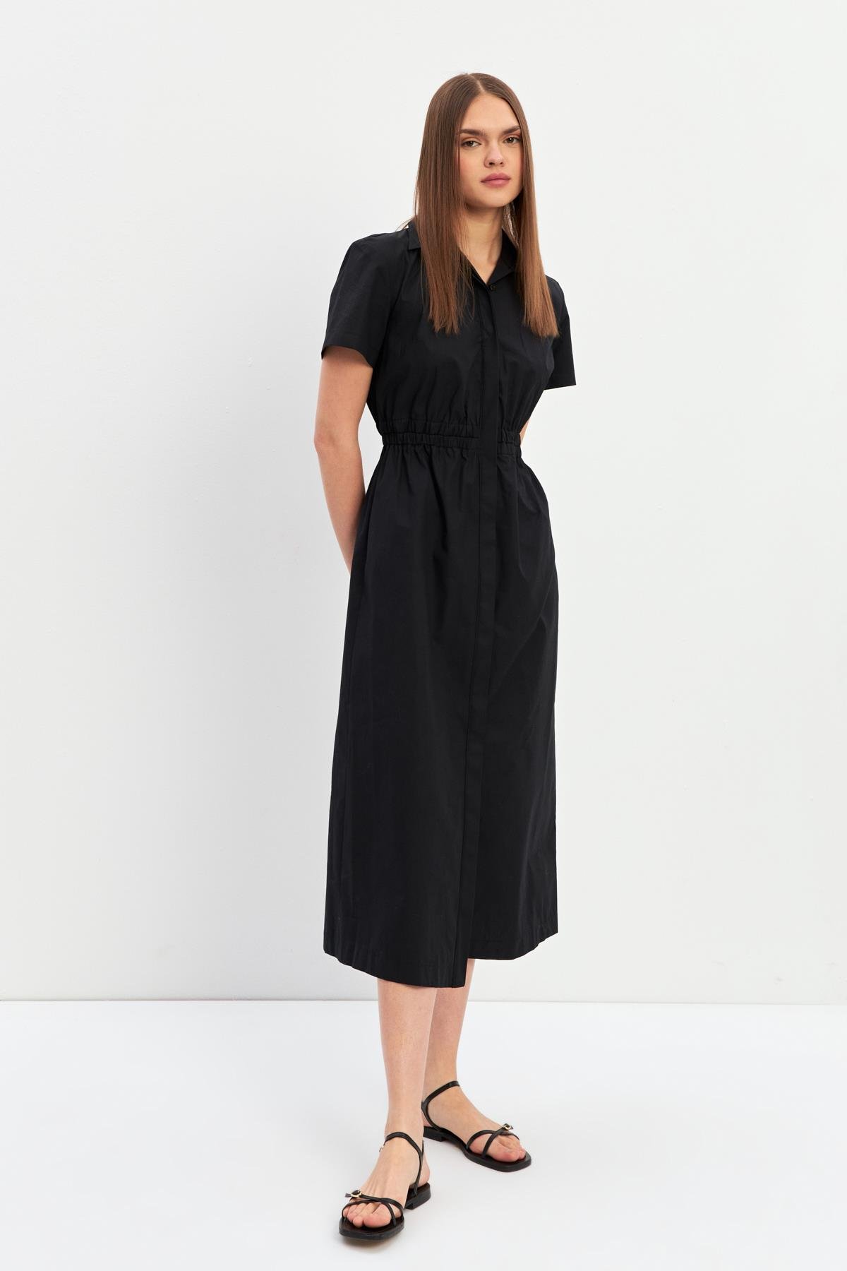 Siyah Gömlek Yaka Belden Büzgü Detaylı Kısa Kollu Elbise (ST090S402238002)