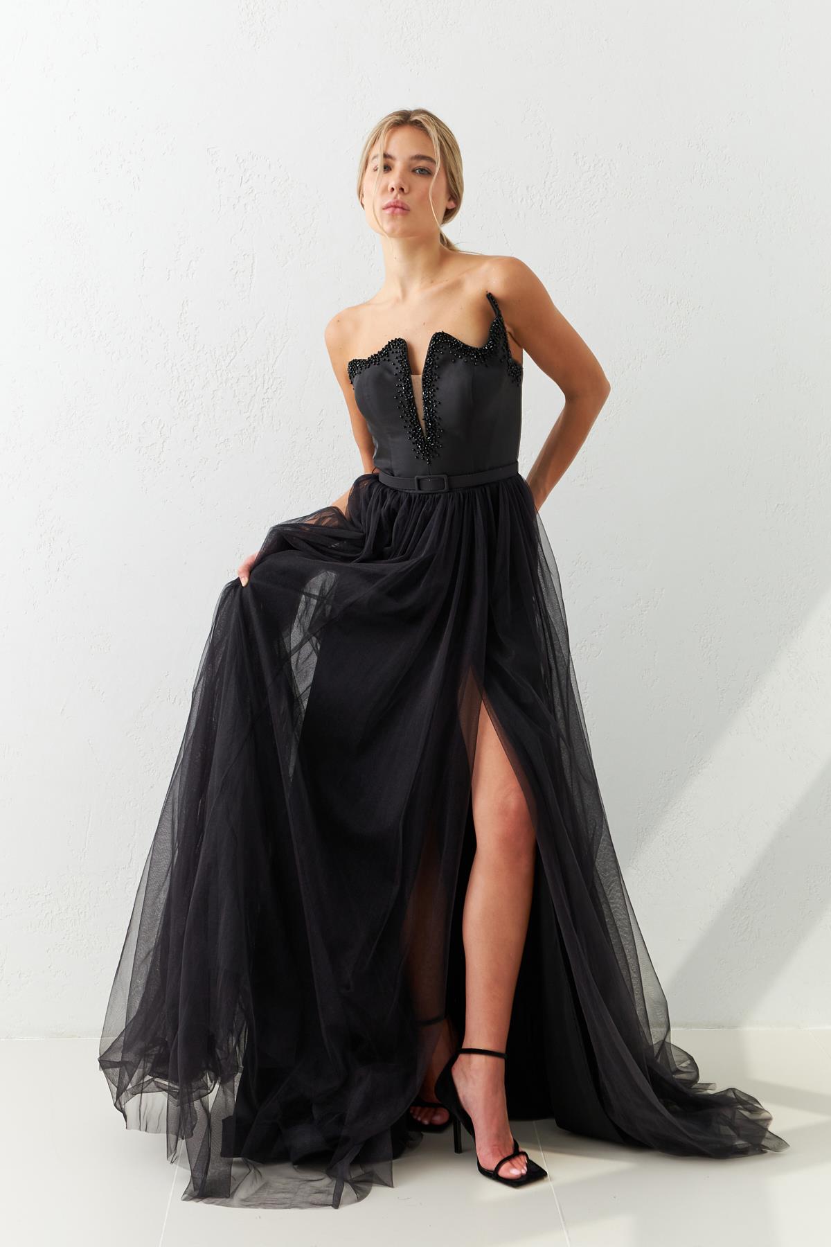 Şıklığı ve zarafeti bir arada sunan bu abiye elbise, etkileyici tasarımıyla özel davetlerinize sofistike bir dokunuş katıyor. Kalp yaka kesimi ve boncuk detaylarıyla göz alıcı bir görünüm sunarken, tül eteği ile zarif bir duruş sağlıyor. Gecenin yıldızı olmaya hazırlanın.