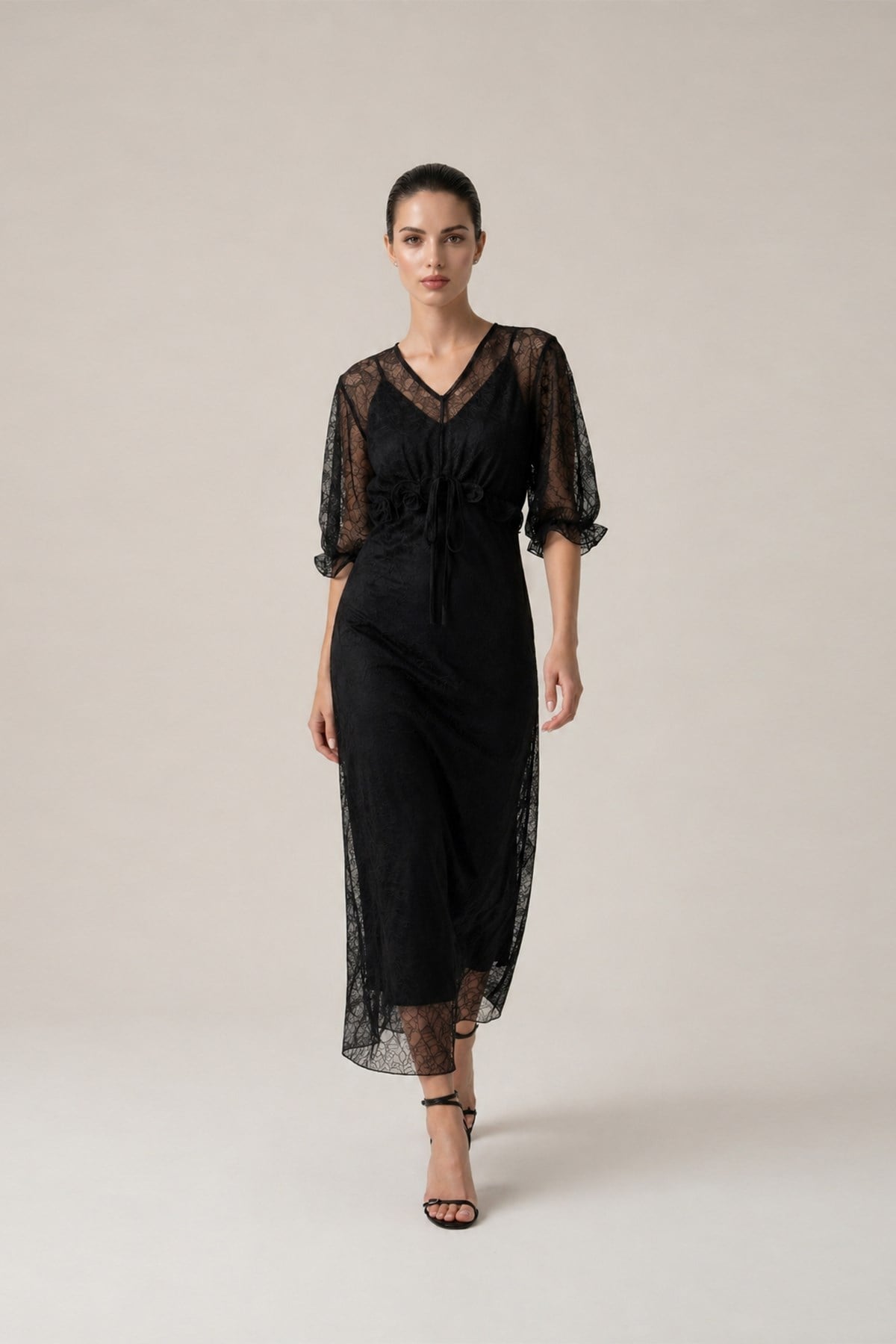 Siyah Kol Ve Bel Detaylı Dantelli Midi Boy Elbise (ST20260S4039881)