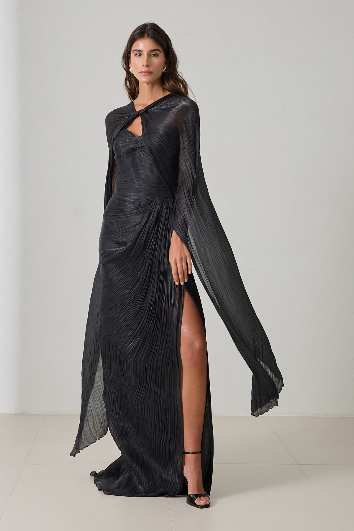 Siyah Pelerin Ve Drape Detaylı Geniş Kalıp Abiye Elbise