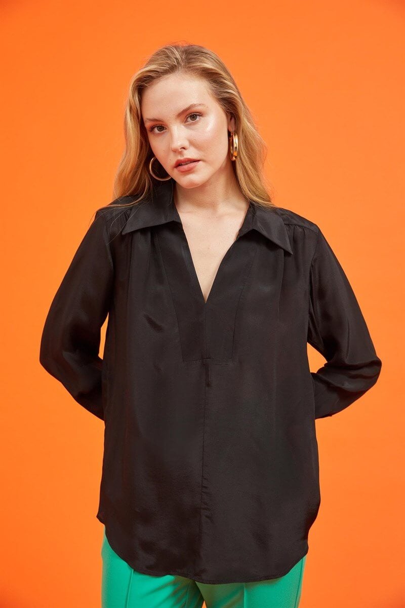 Naif bir kesimi olan bluz, parlak kumaşı ile öne çıkıyor. Truvakar kol bluzu zarif topuklu ayakkabılar ile tamamlayarak modern bir şıklık elde edebilirsiniz.