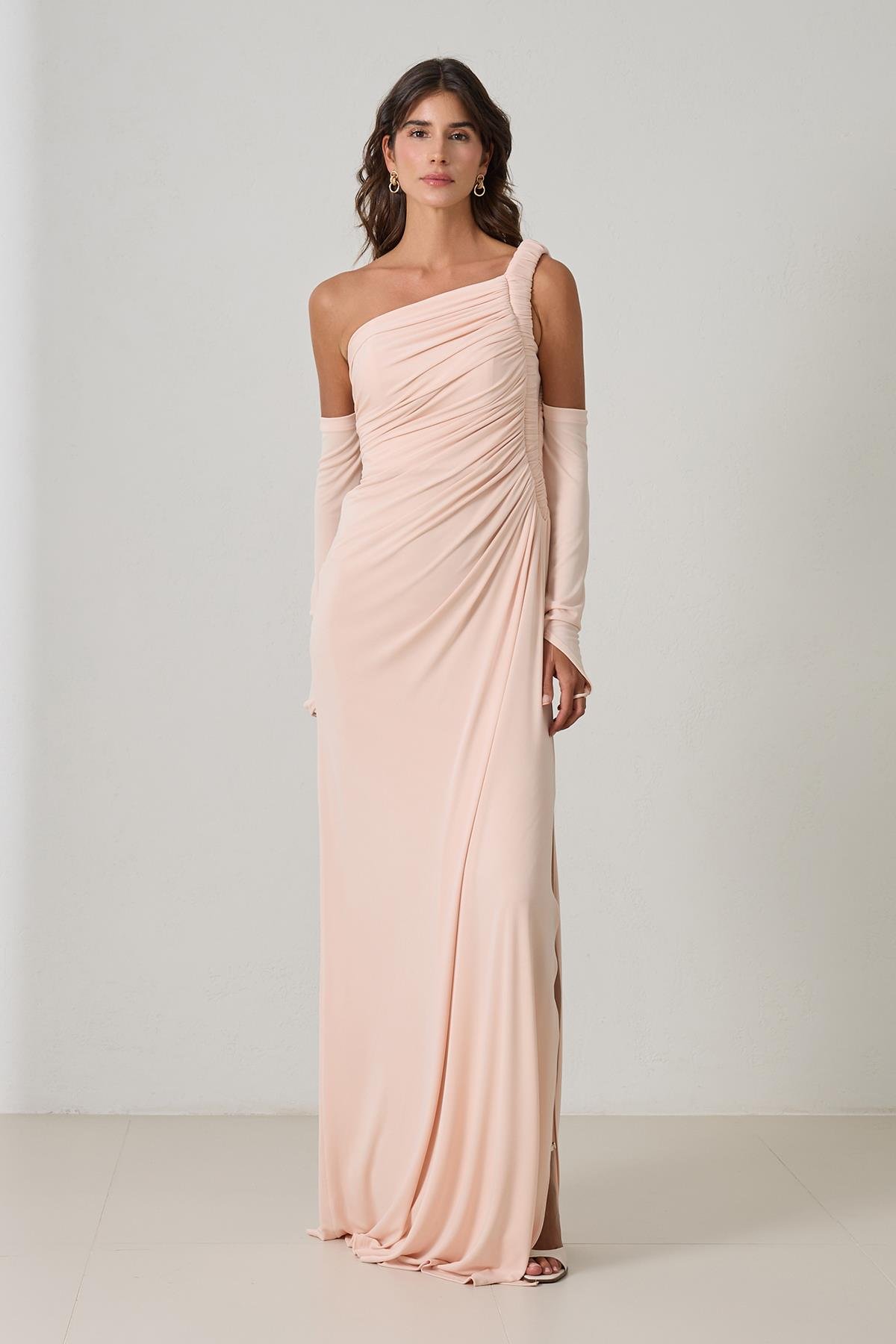 Cesur ve sofistike bir stil arayanların tercihi! Tek omuz tasarımıyla zarif bir asimetri sunan bu uzun abiye elbise, giyilebilir kol detayıyla modern bir dokunuş katıyor. Yandan yırtmaç detayı hareket özgürlüğü sağlarken, feminen ve çekici bir siluet ortaya çıkarıyor. Özel davetlerde, düğünlerde veya unutulmaz gecelerde tüm bakışları üzerinize toplayın. Parlak aksesuarlar ve topuklu ayakkabılarla şıklığınızı zirveye taşıyın.