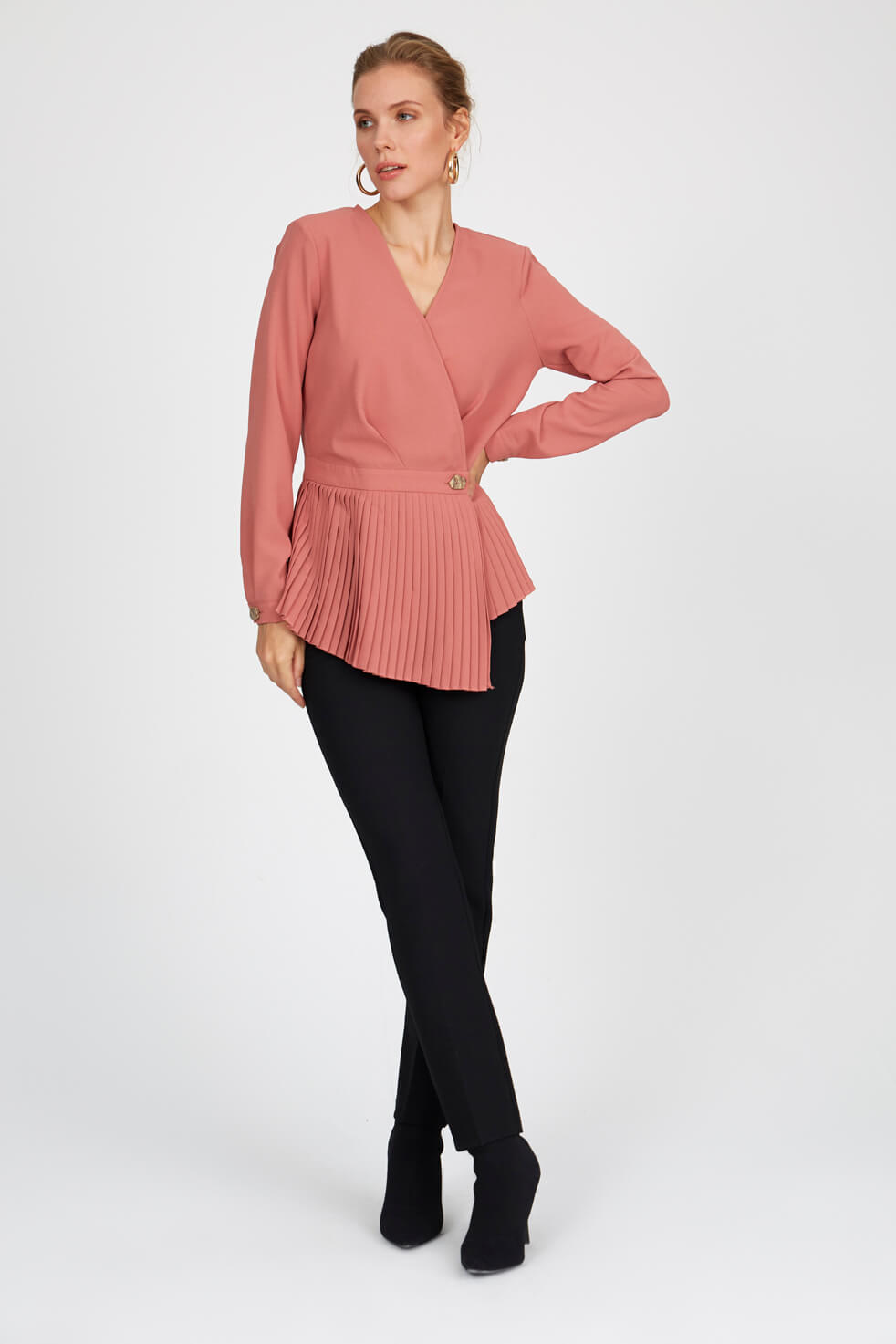 Kruvaze yaka, altı piliseli bluzu dar paça yüksek bel pantolonlar ve tek bantlı topuklu ayakkabılarla kombinleyin.