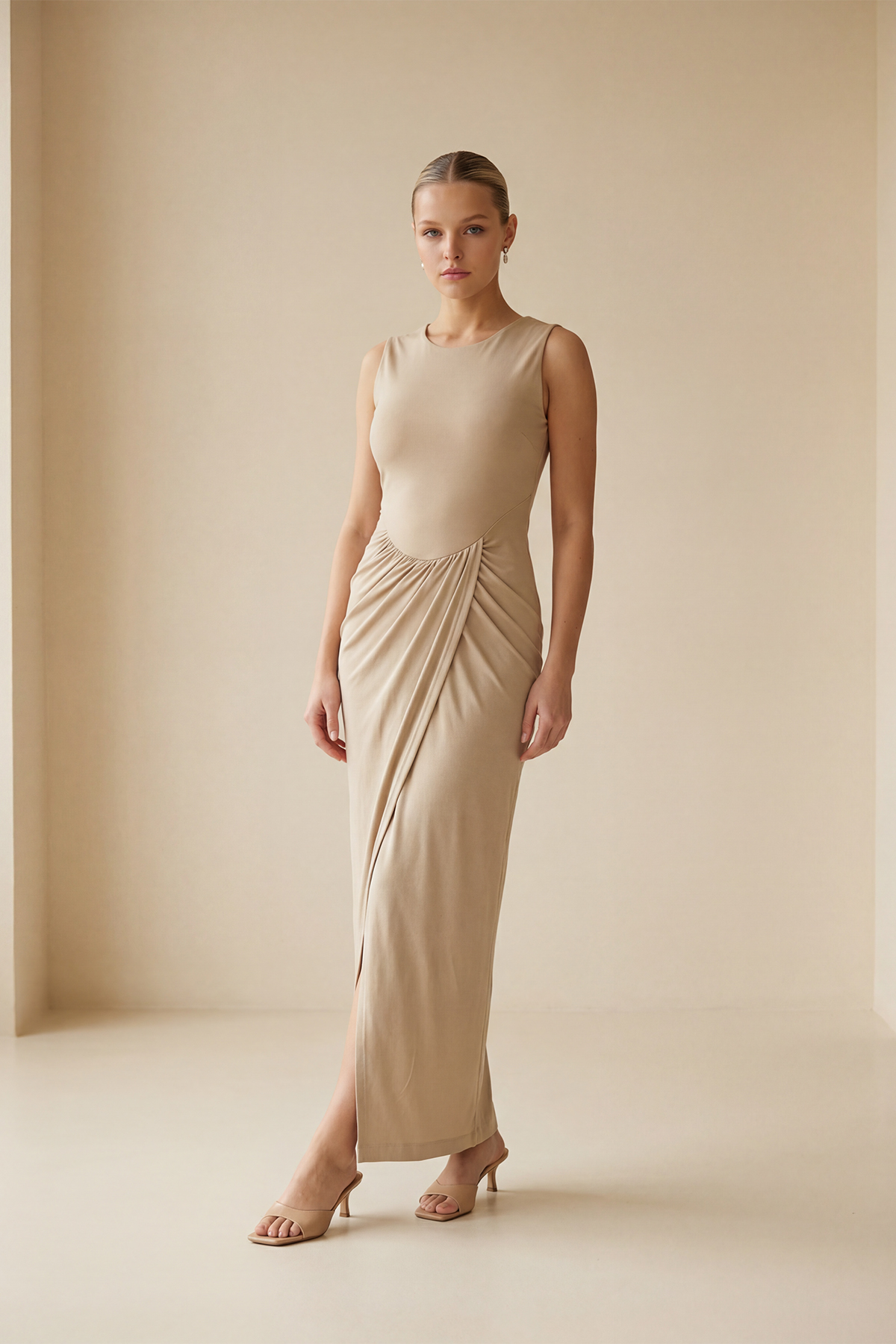 Taş Büzgü Detaylı, Kolsuz Belden Oturtmalı Yırtmaçlı Uzun Elbise (ST20250S40340601)