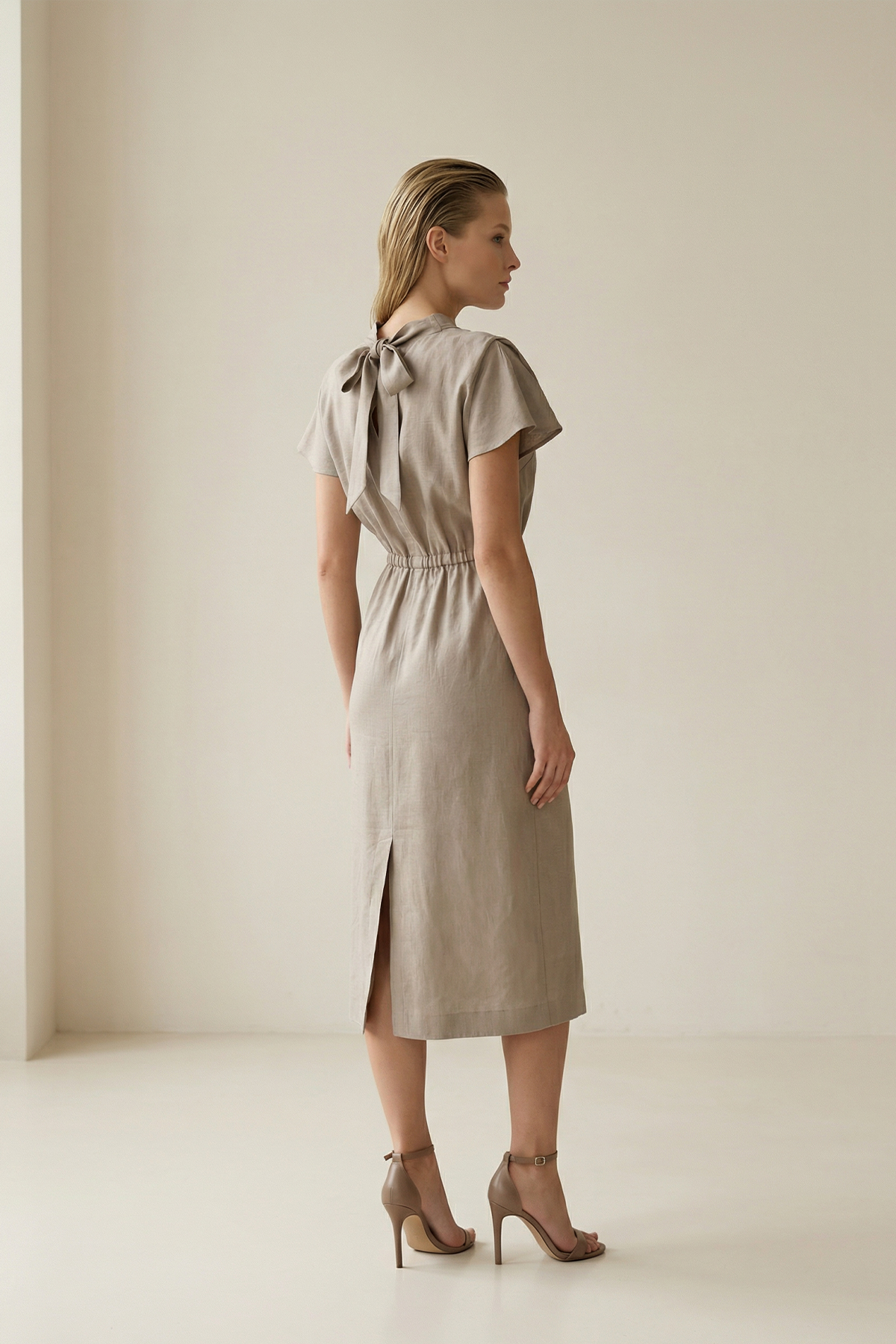 Modern silueti ve özgün detaylarıyla öne çıkan bu elbise, şehirli şıklığı sofistike bir çizgide yorumlar. Balıkçı yaka formu tasarıma güçlü ve rafine bir duruş kazandırırken, ön bölümde yer alan düğüm detayı silueti hareketlendirir. Kısa kollu kesimi ve midi boy uzunluğu dengeli bir görünüm sunarak hem gündüz hem de akşam stillerine uyum sağlar. Zamansız ve karakterli bir stil arayanlar için güçlü bir gardırop parçasıdır.