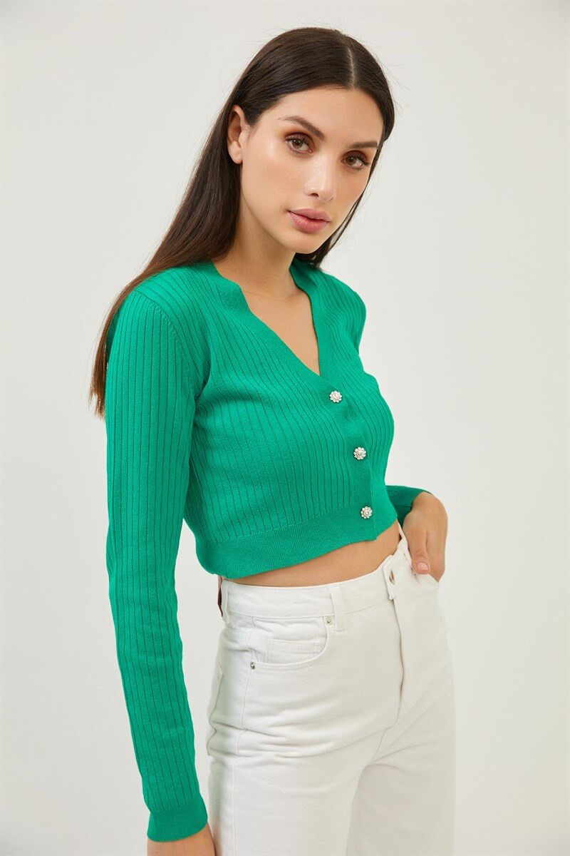 Yalın duruşa sahip triko, şık düğme detaylarıyla havalı bir görünüm kazanıyor. Trikoyu klasik görünümlerden sportif stillere kadar birbirinden farklı birçok kombinde kullanabilirsiniz.